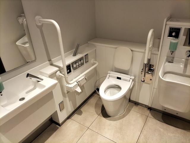 トイレは、2階にあります。 男女別トイレと、多機能トイレの設置です。 トイレ内の設備は、手洗い器、ベビーシート、ベビーチェア、オストメイト対応汚物流し、大便器です。 一般トイレ内にも、ベビーシートの設置がございますので、そちらを優先してご利用ください。 |